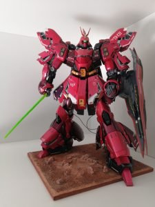 O kit representa o mobile suit do antagonista do filme Char’s Counterattack. Este kit é um dos mais robustos produzidos pela fabricante Bandai em sua escala Master Grade, com pouco mais de 600 peças entre inner frame, peças de sustentação de blindagem, mecanismos e blindagem. Originalmente com slot para Led no lugar onde ficaria o cockpit, excepcionalmente este modelo conta com cockpit transparente avulso.