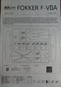 O kit da AZ Model, da República Tcheca, é bastante simples, com poucas peças, mas ainda assim, bem detalhado. A folha de instruções é exatamente isso: uma folha única com as instruções. Além das peças injetadas em estireno cáqui, temos também um pequeno set de photo etched com peças para o cockpit, transparências em chapa de plástico transparente e duas pequenas peças em resina – o motor e os suportes das asas.