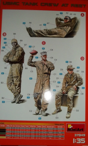 Vem numa caixa de tamanho médio padrão miniart, contendo dois sprues cinza claro. A abertura da caixa é pelas laterais. A MiniArt separou cada figura nos sprues em molduras retangulares, de modo que encontrar cada uma das 4 figuras separadamente, como nos kits traw w/ passagers e US tank crew, apresentados anteriormente. Cada figura é dividida em pernas separadas, tronco, cabeça e braços, com partes adicionais para lenços, chapéus, cachecóis, luvas e algumas partes dos lados de um suporte de placa. A figura A usa óculos e está deitado com as costas contra algo (o tanque?) com os braços atrás da cabeça, relaxando, com a figura D supostamente sentado ao lado olhando para a esquerda. As figuras B e C estão de pé, uma apoiada em algo e a outra prestes a jogar uma bola de futebol americano em alguém que não está na caixa, ou não está esperando uma bela bolada. Eles estão todos vestindo macacão, com uma variedade de bonés de um gorro de malha, cobertura padrão, um de cobertura de selva e sem chapéu. Duas figuras têm suas luvas salientes nos bolsos