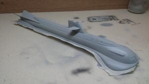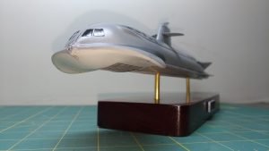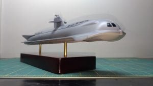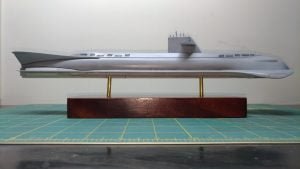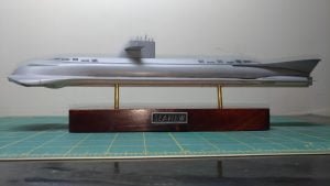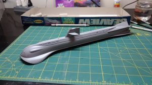 Este é o SeaView, da série Viagem ao Fundo do Mar. Super simples, mas o veículo na série tem mesmo poucos detalhes. Pintei com fundo Aerotech e tintas da Gunze. Envernizado com Corfix e wash Preto Liquitex. As janelas frontas, Preto Brilhante Tamiya e as hélices, bem escondidinhas, com Bronze Humbrol.